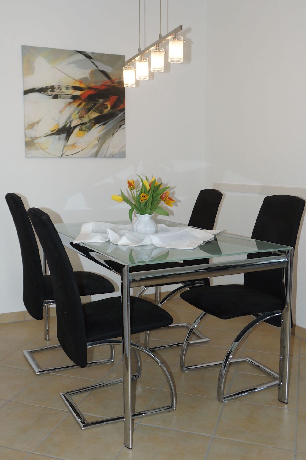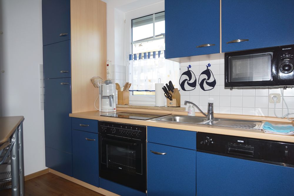 - komplett eingerichtete Küche mit Kühlschrank, Herd, Mikrowelle und Geschirrspüler sowie Inventar (Wasserkocher, Toaster, Geschirr, Gläser usw.)